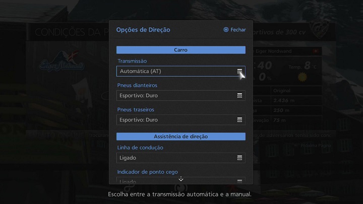 As Opções de Direção podem ser selecionadas no Menu rápido. Selecionar Opções de Direção permite que você ajuste as seguintes configurações (as opções exibidas variaram de acordo com o tipo de corrida):