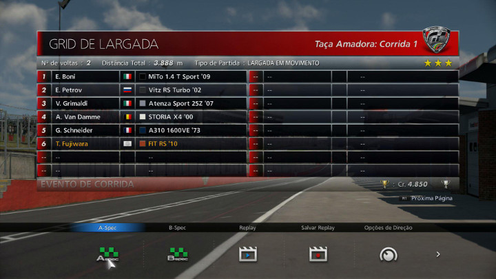 - Reproduzir um replay da corrida anterior. Para obter mais detalhes sobre replays, consulte a página "Replays" na seção "Replay".