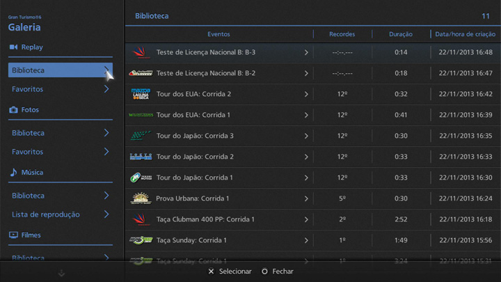 A música do Gran Turismo 6 é gerenciada da “Biblioteca”. Selecione “Biblioteca” e uma lista de músicas será exibida à direita da tela. Cada canção pode ser reproduzida pressionando-se o botão de reprodução à direita de seu nome. Pressione Botão SELECT e você poderá escolher uma das seguintes opções: “Adicionar à música da corrida", “Adicionar à música do menu" ou “Adicionar à música da exibição de slides".