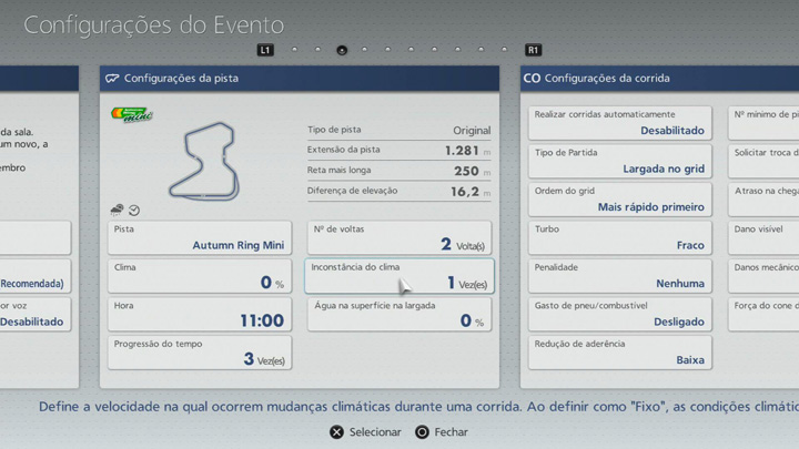 - Define a velocidade na qual ocorrem mudanças climáticas durante uma corrida. Ao definir como "Fixo", as condições climáticas não serão alteradas, enquanto que a definição de um valor alto resultará no aumento da variação climática.
