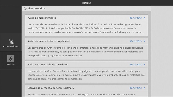 Selecciona "Noticias" en Mi Mundo o en la comunidad para mostrar tu lista de noticias. Esta lista consta de dos partes: "Actualizaciones" y "Noticias". Usa los iconos de la izquierda de la pantalla para pasar de una a otra. La sección "Actualizaciones" contiene información sobre actualizaciones de Gran Turismo 6. La sección "Noticias" contiene otras noticias relacionadas con Gran Turismo 6. Elige una noticia de la lista para leer su contenido.