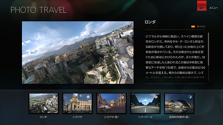 「マイホーム」から[フォトトラベル]を選んで決定すると、ロケーション選択画面に進みます。ロケーションを選んで決定するとそのロケーションのムービーが流れ、その撮影場所のより具体的なイメージをつかむことができます。そのロケーションで撮影を行う場合は、○ボタンを押してください。