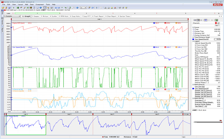 「グランツーリスモ6」のリプレイデータは、MoTeC社のデータ解析用ソフトウェア「i2 Pro」に対応しています。リプレイをMoTeC i2 ProデータとしてUSBメモリに書き出すと、PC上で記録された走行データを図式化でき、解析に役立てることができます。