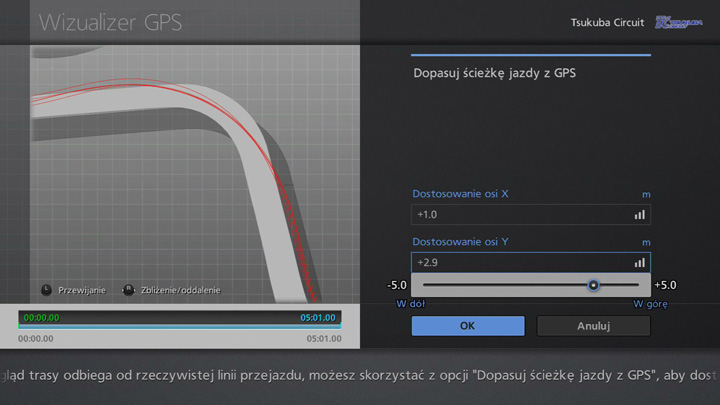 Zmiany powinny być wprowadzone w taki sposób, by linia jazdy wyświetlana na mapie trasy po lewej została dopasowana do prawdziwej linii jazdy, jaka została przez ciebie obrana. Wybierz opcję „Dostosowanie osi X”. Pojawi się suwak, który pozwoli ci przesuwać linię w lewo lub w prawo. Po wybraniu opcji „Dostosowanie osi Y” pojawi się suwak, który pozwoli ci przesuwać linię w górę lub w dół. Możesz użyć lewego i prawego drążka, aby dostosować stopień przybliżenia i przewijać mapę trasy, co pozwoli na łatwiejsze wprowadzanie poprawek.