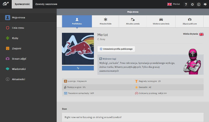 Funkcje społecznościowe gran-turismo.com są takie same, jak w dziale społecznościowym Gran Turismo 6, poza opisanymi poniżej wyjątkami. Opcje „Moja strona”, „Linia czasu”, „Wiadomości”, „Wiadomości”, „Kluby”, „Znajomi” i „Stream zdjęć” dostępne są po lewej stronie ekranu. Kliknij przyciski, by się między nimi przełączać. Więcej informacji znajduje się w dziale „Społeczność” w tej instrukcji.