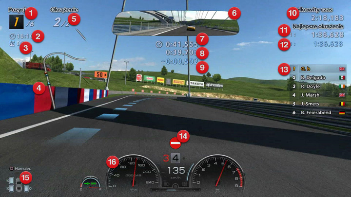 Informacje wyświetlane na ekranie podczas wyścigów są wymienione poniżej. Dokładne informacje będą zależeć od rodzaju wyścigu i wybranego widoku.