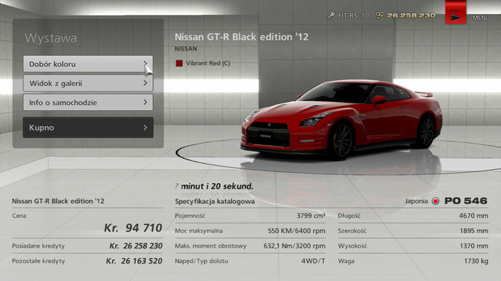 Osiągi katalogowe poszczególnych aut wyświetlają się w prawym dolnym rogu ekranu galerii salonu samochodowego. Zawarte są tam następujące informacje, które podpowiedzą ci, jakie możliwości ma dane auto: