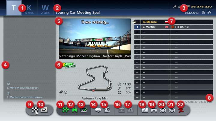 - Aktualny status pokoju. Jasnoniebieski element wskazuje status rozgrywanego obecnie wyścigu. „T” oznacza trening, „K” – kwalifikacje, a „W” oznacza, że właśnie odbywa się wyścig. „PC” oznacza próbę czasową, „PD” próbę driftu, a „WW” wyścig wytrzymałościowy. W przypadku pokojów, w których odbywają się wyścigi bez rundy kwalifikacyjnej, litera „K” nie będzie się wyświetlać. Numer wyświetlany pod literami „K”, „PC” i „PD” oznacza limit czasu (podany w minutach). Numer wyświetlany pod literą „W”, wskazuje liczbę okrążeń podczas wyścigu.