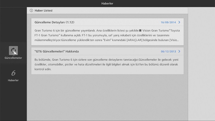 Haberler listenizi görüntülemek için Topluluk alanından veya Evim'den "Haberler"i seçin. Liste iki parçaya bölünmüştür, "Güncellemeler" ve "Bildirimler". Aralarında geçiş yapmak için ekranın sol kısmındaki simgeleri kullanın. "Güncellemeler" bölümünde Gran Turismo 6 için güncelleme bilgileri bulunur. "Bildirimler" bölümünde ise Gran Turismo 6 ile ilgili diğer haberler bulunur. Haberleri tam okumak için haberler listesinden haber seçin.