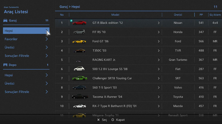 Araç Listesi’ni PP, güç, ağırlık veya yıllara göre sıralayabilirsiniz. Her sıralama geri alınabilir (örn: “Kullanma tarihine göre” sıralamada en yakın zamanda kullandığınız aracı ilk veya son sırada görebilirsiniz). “Düzenle” seçeneği birden fazla araç için kullanılabilir. “Düzenle” seçeneğini kullanmak için her aracın yanındaki kutuyu işaretleyin ve ardından gerçekleştirmek istediğiniz işlemi seçin.