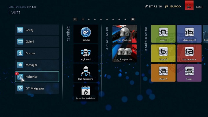 Gran Turismo 6 için güncelleme bilgisi ve bildirimleri "Haberler" bölümünde gösterilir. Eğer yeni bir haber gelirse, Evim içindeki haber simgesinde kırmızı bir daire görünecek, bir dizi yeni haberin mevcut olduğunu belirtecektir. "Evim"den "Haberler" kısmını seçmek sizi Topluluk alanının "Haberler" bölümüne götürecektir.