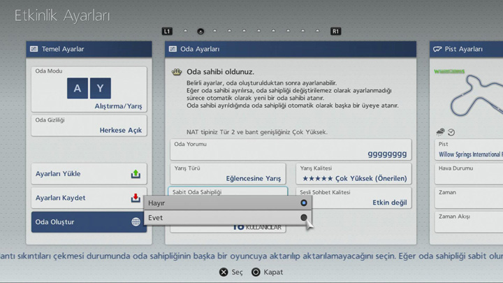 Açık Lobi Modu’nda odayı yaratan oyuncu odanın sahibi olur. Oda ayarlarını değiştirerek oda sahipliğinin değişkenliğini ayarlayabilirsiniz. Sabit Oda Sahipliği seçeneğini seçip seçmeyeceğiniz, oda sahibinin bölge tipi ve internet bağlantısına göre belirlenmelidir. Daha fazla detay için lütfen aşağıya bakınız. NAT ve bant genişliğiyle ilgili daha fazla detay için lütfen “Sorunsuz Çevrimiçi Yarış Yapma” sayfasına bakınız.