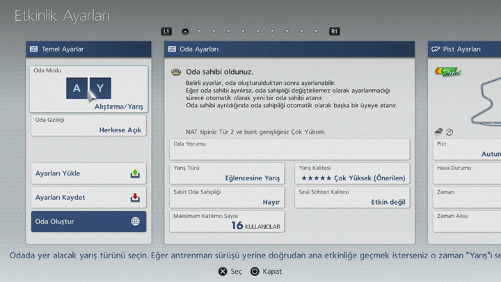Oda Oluşturma ekranına geçmek için Açık Lobi Modu’ndayken, Oda Seçimi ekranından ”Yeni Yarat" seçeneğini seçin. Oda Oluşturma ekranı şu bloklara bölünmüştür: Temel Ayarlar, Oda Ayarları, Pist Ayarları, Eleme Ayarları, Yarış/Zamana Karşı Yarış/Drift Denemesi/Serbest Sürüş/Dayanıklılık Yarışı Ayarları, Araç Seçim Metodu, Performans Filtreleri ve Sürüş Sınırı Seçenekleri. Her bir blok, çeşitli ayarları değiştirmenize imkân tanır. ("Eleme Ayarları"nın yalnızca "Temel Ayarlar" bloku içinde bulunan "Oda Modu"nun "Alıştırma/Elemeli/Yarış" veya "Alıştırma/Elemeli/Dayanıklılık Yarışı" olarak ayarlanması halinde görüneceğini lütfen dikkate alın.)
