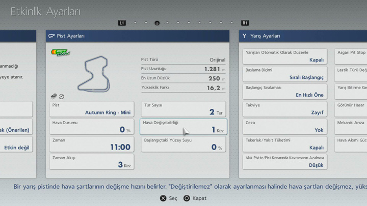 - Bir yarış pisti üzerindeki hava durumunun değişim hızını belirler. "Değiştirilemez" olarak ayarlandığında hava hiç değişmezken, yüksek değerlerde hava sürekli farklılık gösterir.