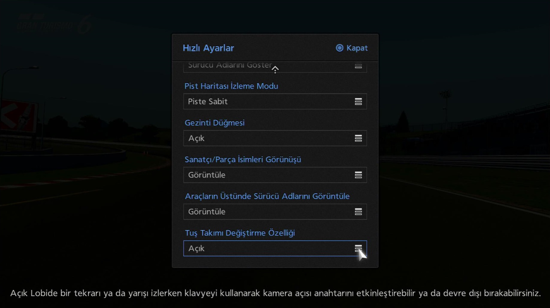 Açık Lobi modunda bir tekrarı izlerken ya da bir yarışı seyrederken 'Klavye Değiştirme Özelliği'ni araç çubuğundan değiştirmek, kamerayı değiştirmenizi ve tuş takımını kullanarak bilgileri görüntülemenizi sağlar. Bu özelliği kullanmak için lütfen PlayStation®3 sisteminize bir USB klavye ya da benzeri bir cihaz bağlayın.