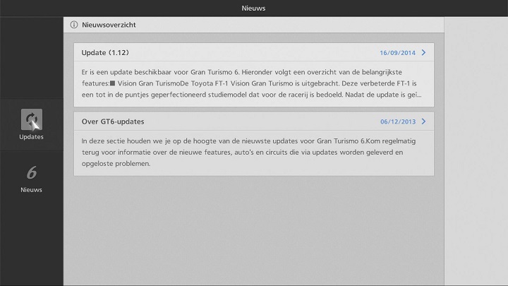 Update-informatie en nieuws voor Gran Turismo 6 worden weergegeven in de sectie Nieuws. Als er nieuws is, verschijnt er een rode cirkel op het nieuws-icoontje in Mijn huis die aangeeft hoeveel nieuwsberichten er zijn. Als je de optie Nieuws selecteert in Mijn huis, ga je naar de sectie Nieuws in het Community-gebied.