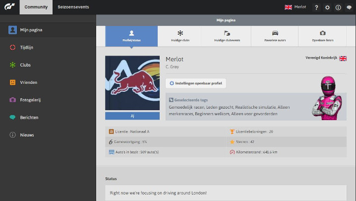 De Community-opties op gran-turismo.com komen overeen met die in het Community-gebied van Gran Turismo 6, met uitzondering van het onderstaande. De opties Mijn pagina, Tijdlijn, Berichten, Nieuws, Clubs, Vrienden en Galerij vind je links op het scherm. Klik op de knoppen om te schakelen tussen deze opties. Raadpleeg de sectie Community van deze handleiding voor meer informatie over deze opties.