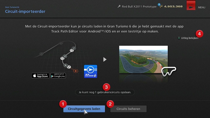 - Hier zie je hoeveel gebruikerscircuits je nog kunt opslaan. Je kunt maximaal dertig gebruikerscircuits opslaan in GT6. Circuits die zijn gemaakt door je vrienden uit het Community-gebied tellen ook mee.