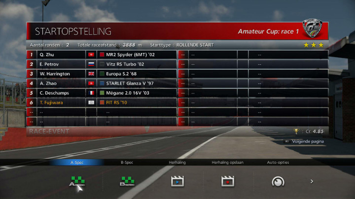 Voor elke race zie je een scherm met de omstandigheden op het circuit en de startopstelling (bij tijdritten en driftproeven wordt het klassement getoond). Onder in het scherm wordt het Snelmenu weergegeven. De volgende opties zijn beschikbaar via het Snelmenu (welke opties worden getoond is afhankelijk van het racetype en de racesituatie):