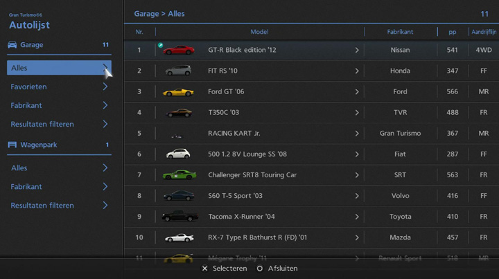 Je autolijst is onderverdeeld in de garage, waar je de auto's vindt die je het meest gebruikt, en het wagenpark, waar de rest van je collectie staat. Bedenk goed hoe vaak je met een bepaalde auto rijdt voor je hem opslaat. Er passen maximaal 500 auto's in je garage, terwijl je wagenpark ruimte biedt aan 9999 auto's.