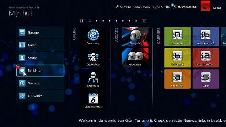 Om de optie Berichten te gebruiken, moet je zijn aangemeld op PSN℠ voor je Gran Turismo 6 opstart. Raadpleeg de pagina Berichten in de sectie Community van deze handleiding voor meer informatie over de optie Berichten.