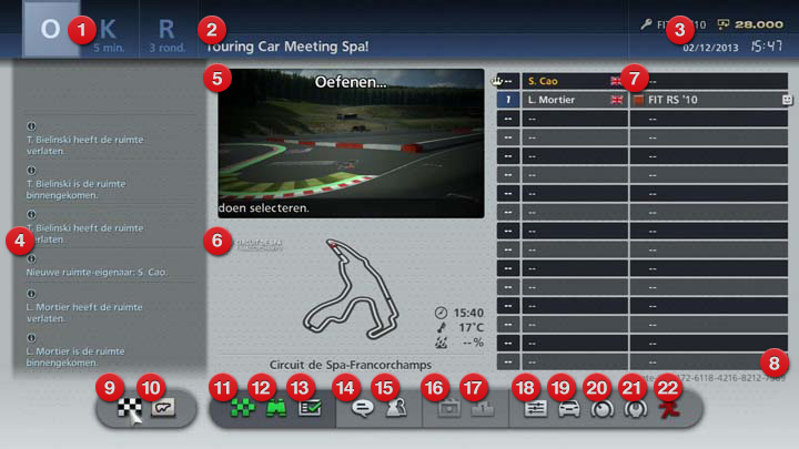 - Huidige ruimtestatus. Het helderblauwe deel geeft de status weer van de race die momenteel plaatsvindt. O staat voor oefenen, K voor kwalificatie en R voor de race zelf. De T staat voor Tijdrit, de D voor Driftproef en de E voor Endurancerace. De K wordt niet weergegeven in ruimtes waarin je je niet hoeft te kwalificeren voor de race. Het nummer onder de K, T of D geeft de tijdslimiet in minuten aan. Het nummer onder de R geeft het aantal ronden van de race zelf aan.