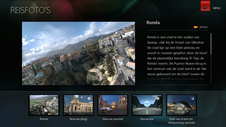 Nadat je de functie Reisfoto's hebt geselecteerd ga je naar het scherm Autolocatie kiezen. Selecteer een locatie om het bijbehorende filmpje te bekijken voor meer informatie over de locatie. Als je op de gekozen locatie foto's wilt nemen, druk je op de X-toets.