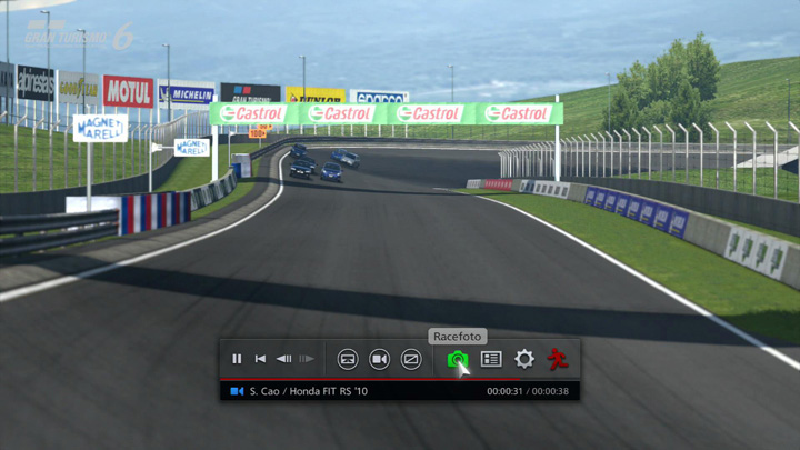 Als je een herhaling bekijkt via de optie Herhaling in het Snelmenu of een race bekijkt in de open lobby verschijnt er als je op de X-toets drukt een taakbalk met de onderstaande opties.