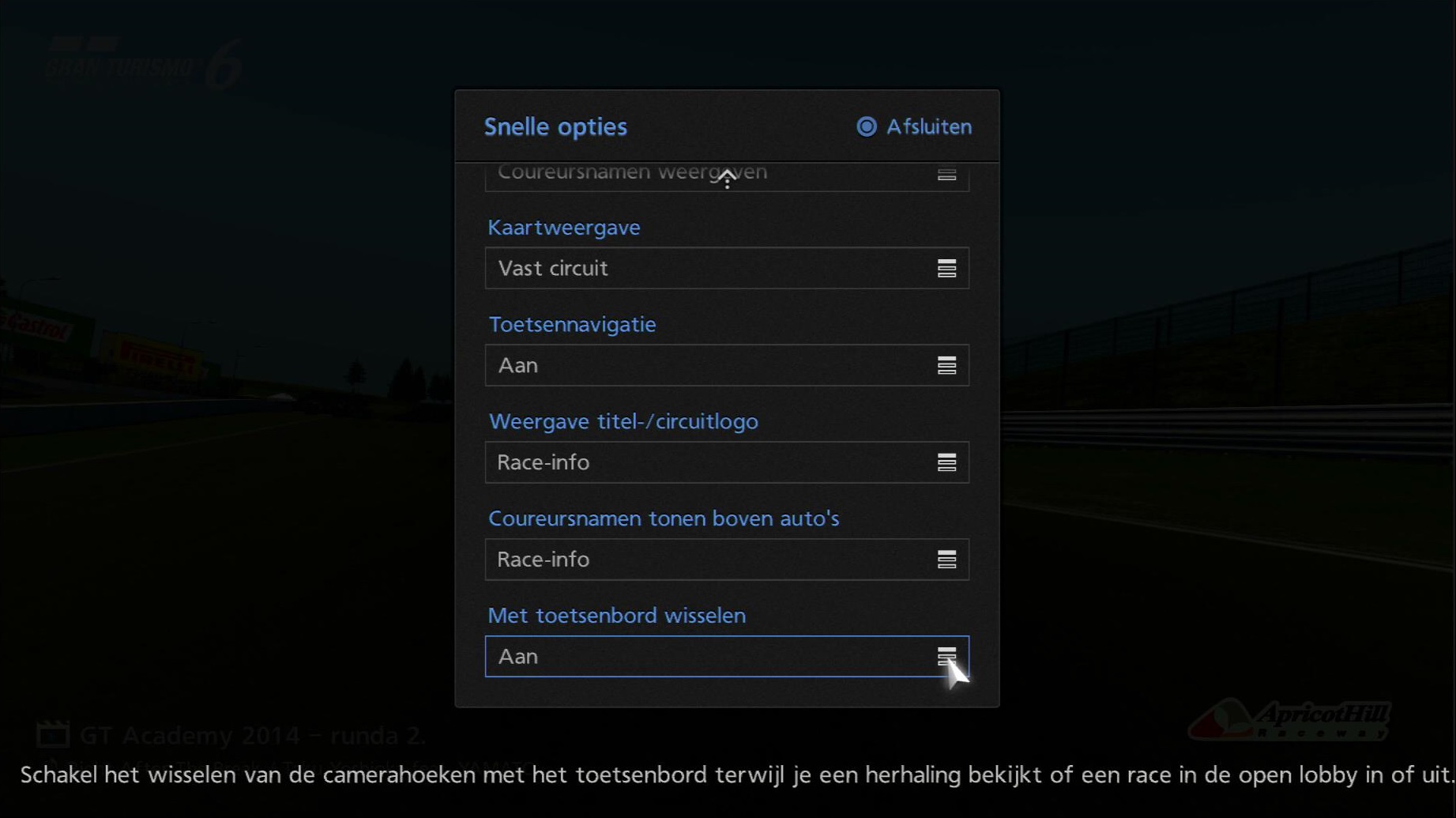 Terwijl je een herhaling bekijkt of een race bekijkt in het speltype Open lobby, kun je de camera en de informatie die wordt weergegeven wijzigen met je toetsenbord als je de optie Met toetsenbord wisselen selecteert. Sluit een USB-toetsenbord of een vergelijkbaar apparaat aan op je PlayStation®3-systeem om gebruik te maken van deze feature.