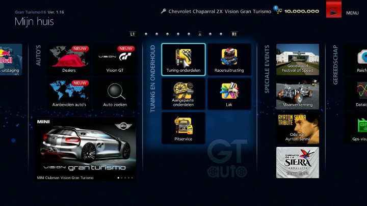 - Hier kun je tuning-onderdelen kopen om de specificaties van je auto te verbeteren. De onderdelen zijn verdeeld in categorieën. Via Garage -> Auto-instellingen kun je de gekochte onderdelen installeren en aanpassen.