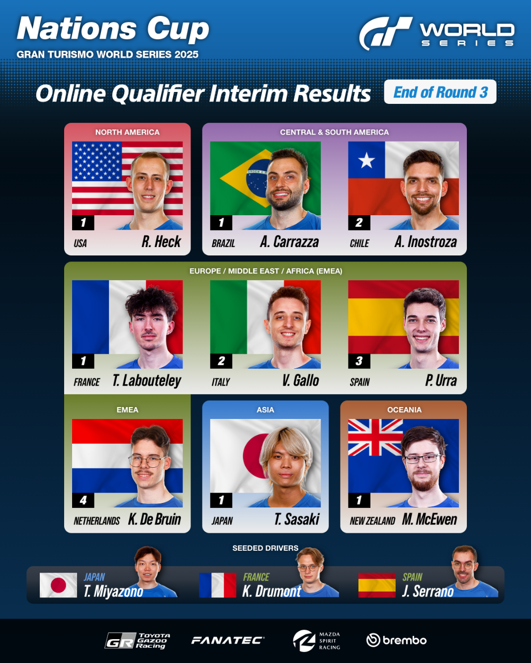 Op 30 april is de uitslag gepubliceerd van de online kwalificatie voor de Gran Turismo World Series 2025 – Nations Cup, die na ronde 3 halverwege is. Hieronder zie je de huidige tussenstand van de hoogst geklasseerde landen/gebieden en spelers.