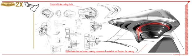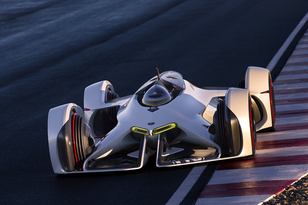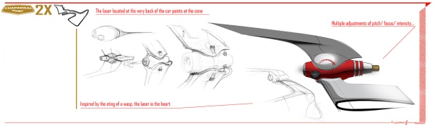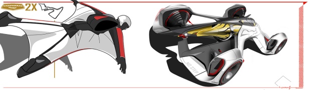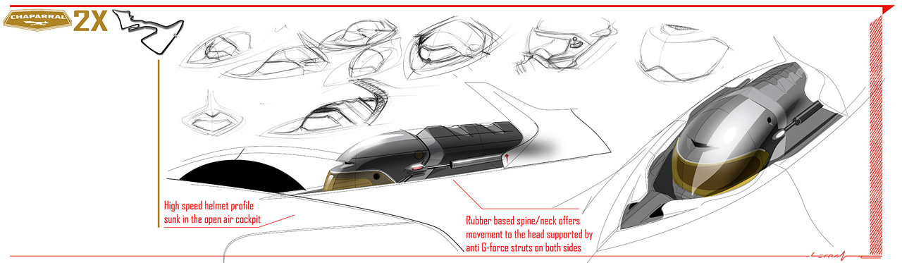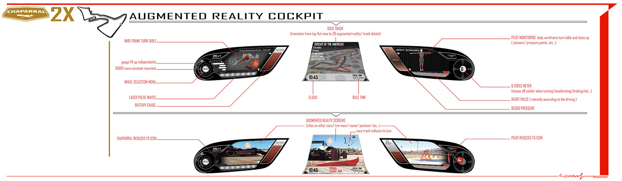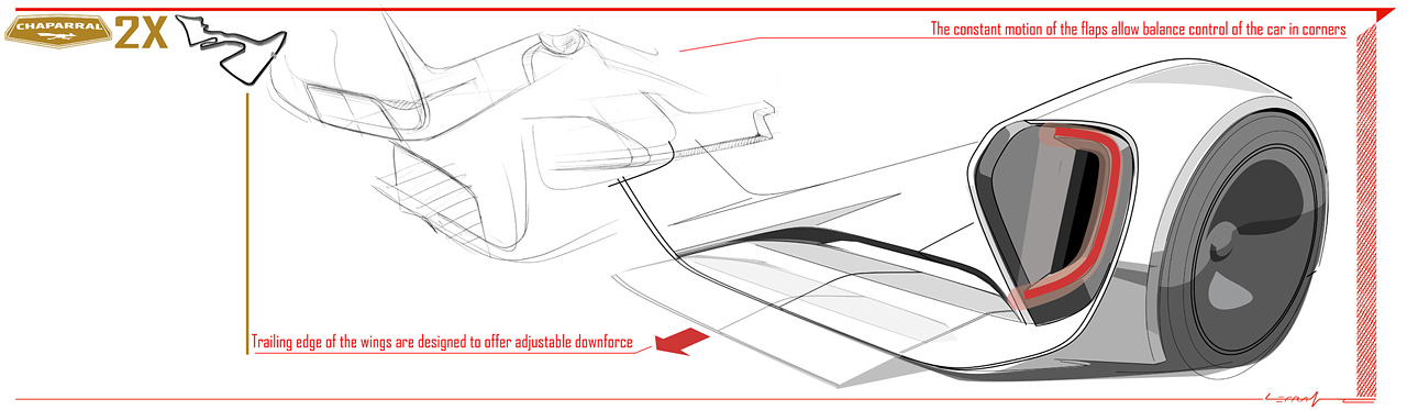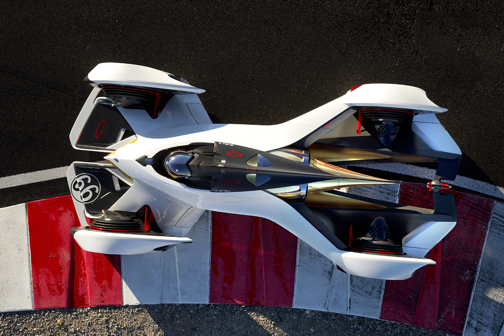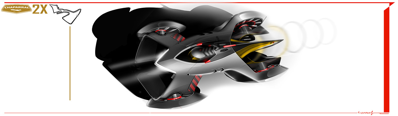 De gedachte achter de Chevrolet Chaparral 2X Vision Gran Turismo was een ‘Garage 56’ experimenteel prototype voor Le Mans, maar hij geeft ook een inkijkje in de toekomst van de autosport. De inspiratie werd gevonden in een combinatie van het sensationele gevoel van vliegen in een wingsuit en deelnemen aan een Moto GP. Een ervaring waarbij de bestuurder van de 2X over het circuit vliegt, voorovergebogen, luttele centimeters boven de oppervlakte. De door Chevrolet ontworpen krachtbron van de 2X is een ongekend staaltje machtsvertoon. Dankzij dit geavanceerde aandrijvingssysteem stuwt de 2X zich met behulp van laserpulsschokgolven over het circuit.De positie van de coureur zorgt voor een van de meest opwindende ervaringen ooit in de autosport. Dankzij de architectuur en het design van de auto wordt de coureur één met het voertuig door er voorovergebogen in plaats te nemen. Als het schuifdak dicht is, gaan de vorm van de 2X en het uitgestrekte lichaam van de coureur naadloos in elkaar over. Handen en voeten besturen het voertuig onafhankelijk van elkaar, waarbij alle wrijvingsloze, van magneten voorziene, wielen worden gebruikt. Gas geven, gas minderen en sturen: het verloopt allemaal via de fysieke bewegingen van de 2X-coureur, die voor het eerst vier echte besturingsmechanismen tot zijn beschikking heeft. Voor het remmen wordt gebruikgemaakt van een combinatie van de magnetische ‘re-gen’-remklauwen van Brembo en de AeroBrake-panelen in de carrosserie van de 2X.