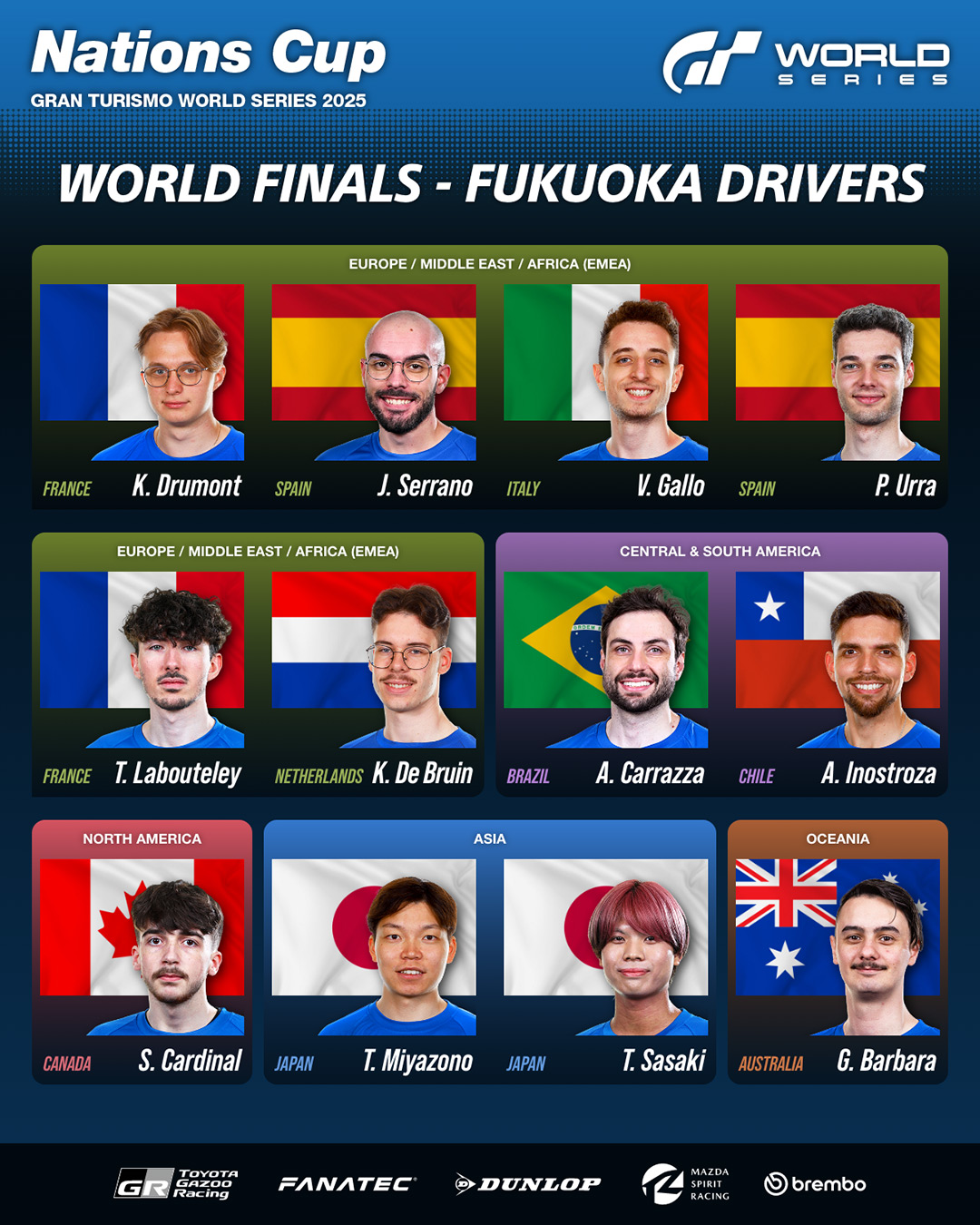 A Nations Cup é uma competição em que os pilotos representam seu país ou território de origem. A competição reúne os 12 melhores pilotos, combinando os mais bem classificados nas Classificatórias Online de cada região e os três pilotos mais bem classificados na Classificação por Pontos da World Series do ano passado, que participam como cabeças de chave. Depois de disputas intensas em Londres, Berlim e Los Angeles, eles buscarão conquistar o cobiçado título da Nations Cup em Fukuoka.