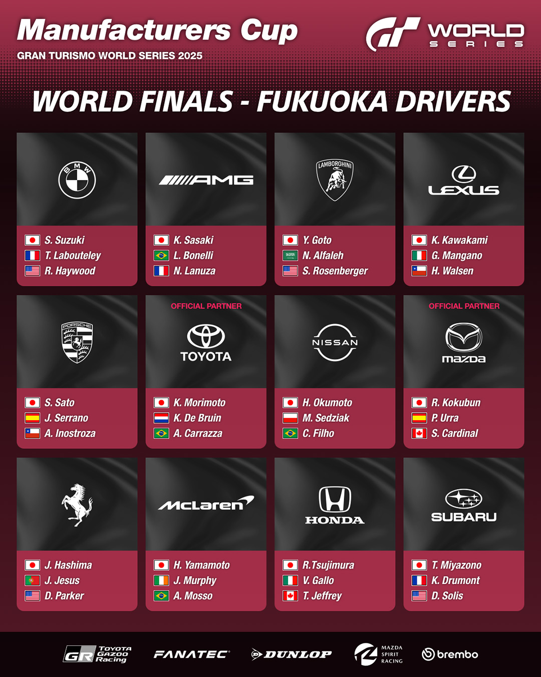 Os dois dias das World Finals serão apresentados por Sascha Böckle, renomado locutor esportivo da Fórmula 1 e de vários eventos de automobilismo no Japão, juntamente com Jules Hardy, que apresenta e faz consultoria para a BBC e o BAFTA no Reino Unido. Essa fusão de Inglaterra e Japão criará uma atmosfera realmente global, adicionando emoção ao evento e à ação na pista quando os campeões de 2025 forem coroados em Fukuoka.