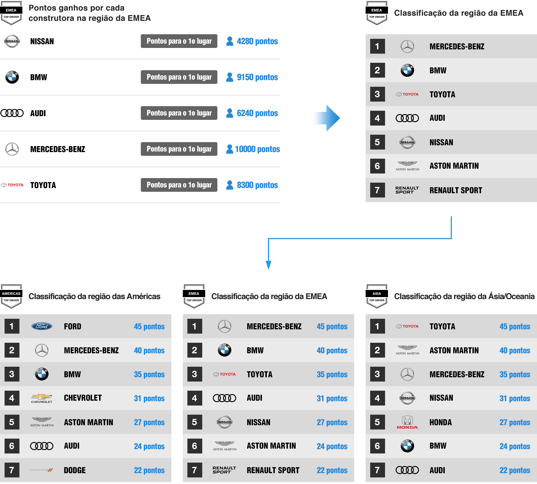 Para cada Região da Temporada Final Online, os pontos obtidos pelos melhores jogadores do placar de cada construtora contarão para a pontuação total dessa construtora.