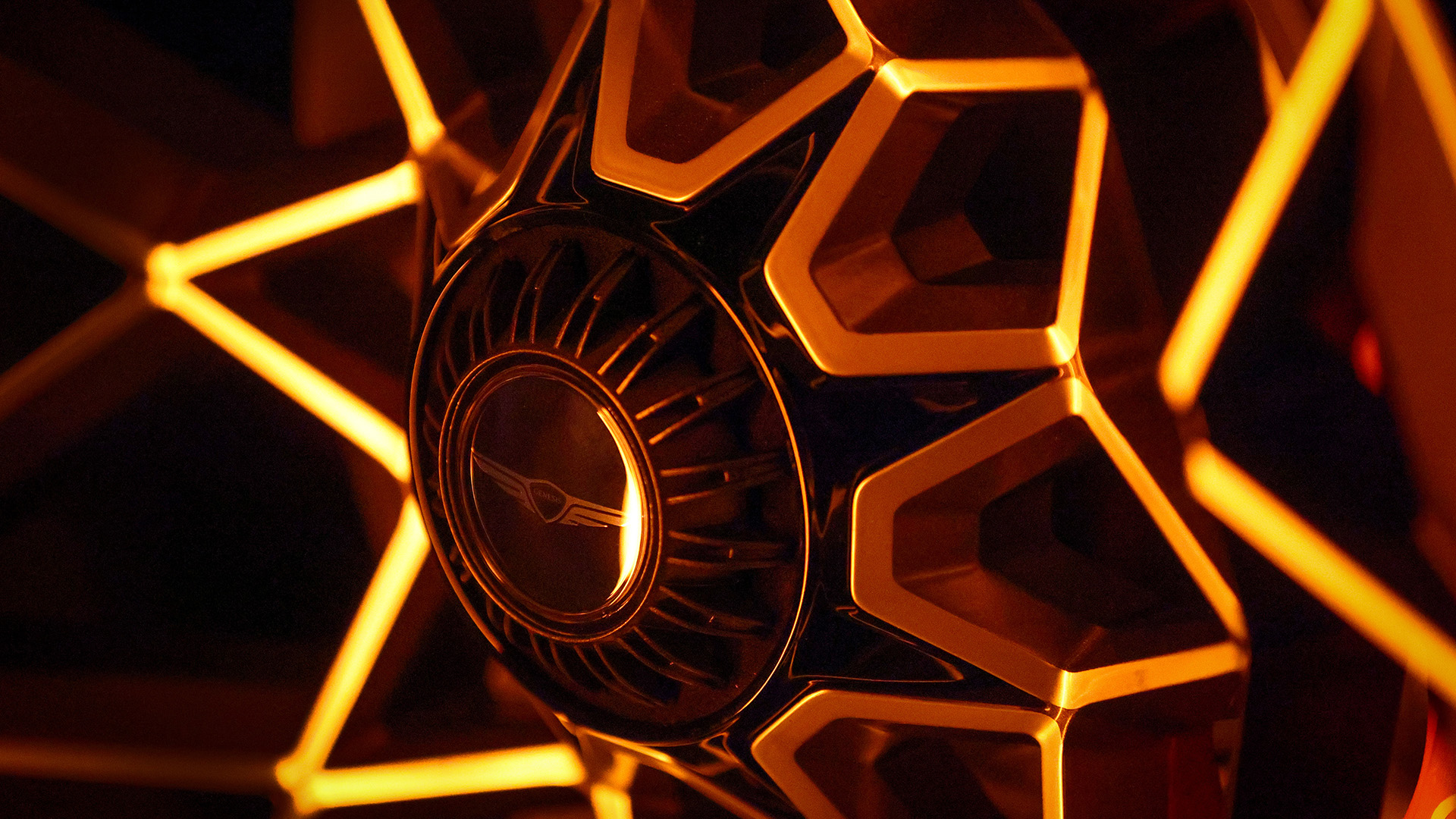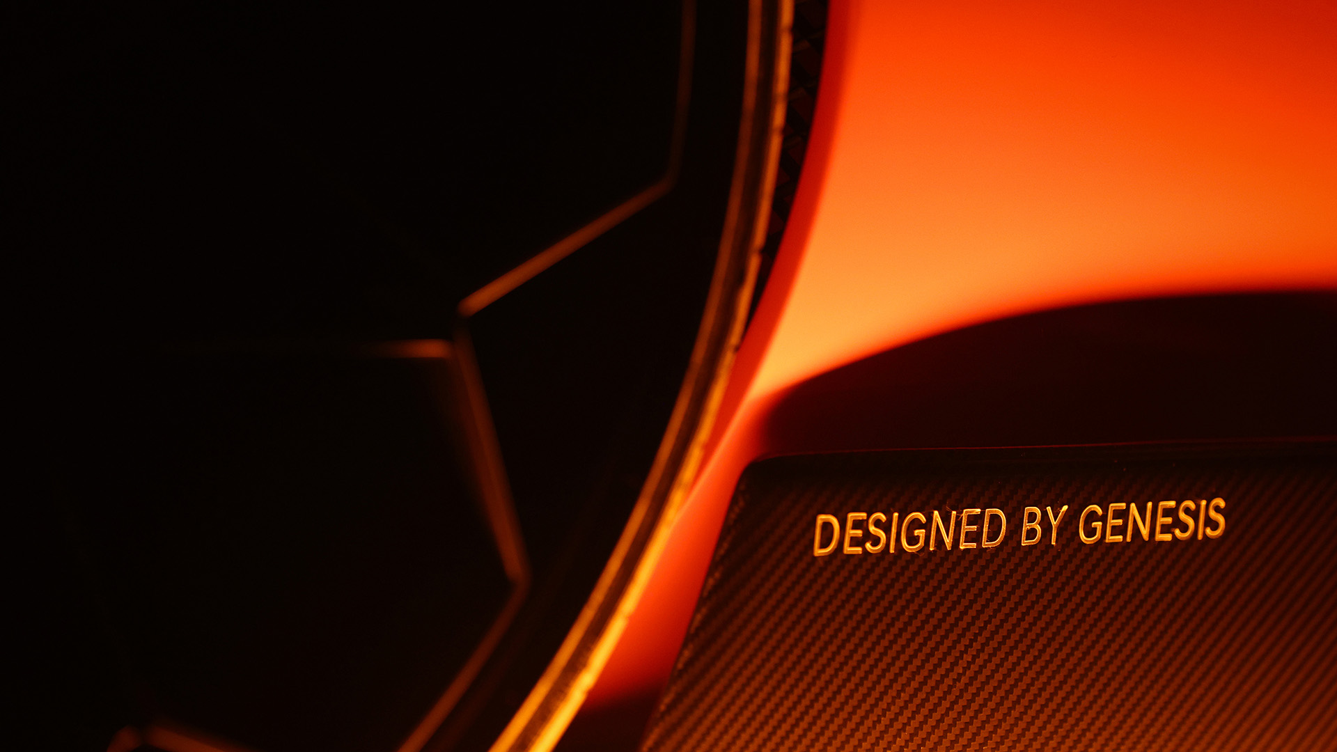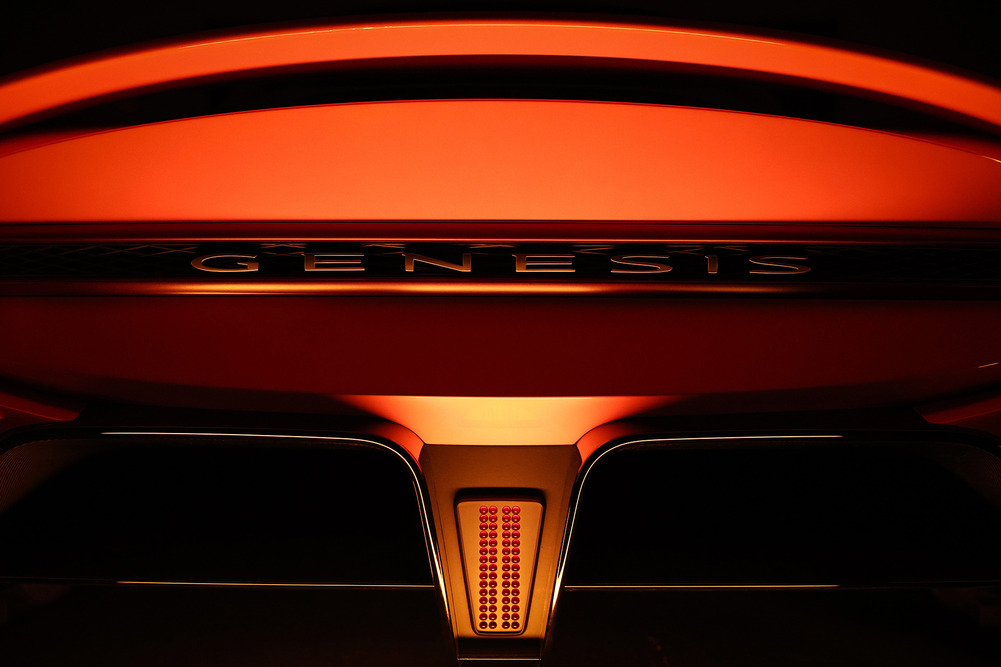 O carro ostenta a nova dianteira da Genesis, que torna mais abstrata a grade com o escudo e a conecta aos faróis quádruplos, estruturando e interligando os volumes da dianteira à traseira com as duas linhas distintivas da marca.