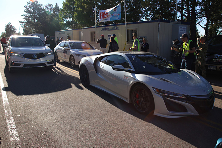 Le 7:40 del giorno decisivo. Le pace car segnalano la partenza della prova finale. La NSX davanti a tutti è guidata da Kazunori Yamauchi, mentre le Acura MDX e TLX che seguono hanno al volante delle leggende di Pikes Peak, Randy Schranz e Leonard Vahsholtz.