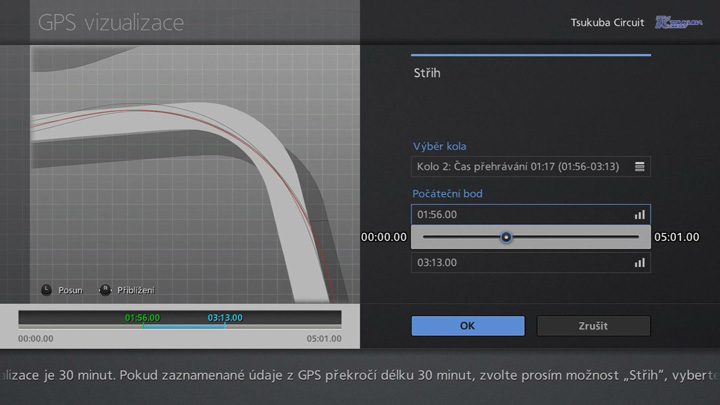 Minimální délka náhledu pořízeného pomocí GPS vizualizace je 1 minuta, maximální délka pak 30 minut. Pokud zaznamenané údaje z GPS překročí délku 30 minut, zvolte prosím možnost „Střih“ a vyberte požadovanou část záznamu.