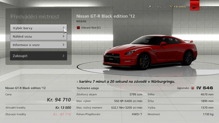 Katalogová výkonnost vozu je zobrazena v pravém dolním rohu na obrazovce Předváděcí místnosti autosalónu. V katalogovém výkonu vozu najdete informace, z nichž můžete usoudit, jaké má automobil vlastnosti. Zde je jejich výčet: