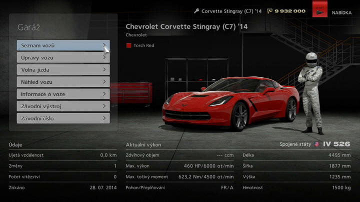 V garáži můžete provádět správu vozů, které vlastníte, ať už se jedná o změnu právě řízeného vozu nebo úpravu některých nastavení. V pravém horním rohu hlavní obrazovky garáže najdete vůz, který právě řídíte a oblek, který právě máte na sobě. Stav a specifikace aktuálního vozu najdete v dolní části obrazovky.
