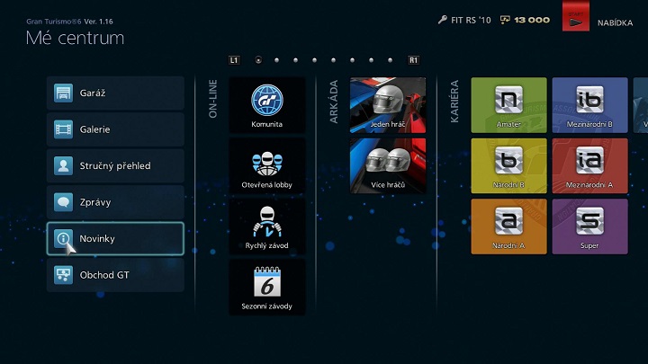 Pokud chcete vidět poslední novinky, přihlaste se prosím k síti PlayStation®Network, ještě než spustíte hru Gran Turismo 6. Více podrobností o funkci zasílání zpráv se dozvíte na stránce „Novinky“ v oddíle „Komunita“ tohoto manuálu.