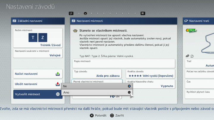 V režimu Otevřená lobby se vlastníkem místnosti stává hráč, který místnost založil. Úpravou nastavení místnosti můžete zvolit, zda má být vlastnictví místnosti pevné. Rozhodnutí, zda zvolit pevné vlastnictví, závisí na kvalitě připojení vlastníka a typu NAT. Podívejte se na stránku „Jak si užít plynulé závody on-line“.