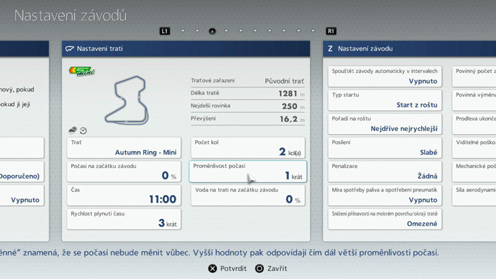 - Umožňuje nastavit počasí na startu závodu. Při nastavení 0 % budou podmínky perfektní, ale čím bude hodnota vyšší, tím horší podmínky budou na startu závodu panovat. Škála začíná u zatažené oblohy, pokračuje přes mrholení a končí průtrží mračen. Po začátku závodu se bude počasí měnit náhodně.