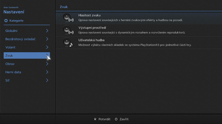 - Umožňuje upravit nastavení související s dynamickým rozsahem a rozložením reproduktorů. Chcete-li si vychutnat Gran Turismo 6 se 7.1kanálovým zvukem, nastavte prosím „Rozložení reproduktorů“ na možnost „7.1ch Surround Sound“.