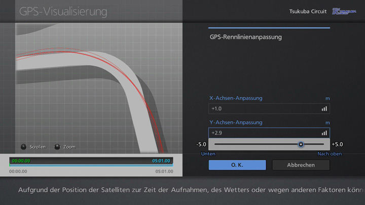 Aufgrund der Position der Satelliten zur Zeit der Aufnahmen, des Wetters oder wegen anderer Faktoren können kleine Fehler in den GPS-Daten auftreten. Wenn die Vorschau sich stark von der tatsächlichen Strecke unterscheidet, können Sie „GPS-Rennlinienanpassung“ auswählen, um die Linie sowohl horizontal als auch vertikal zu manipulieren.