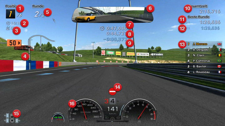 Die Informationen, die während eines Rennens auf dem Bildschirm zu sehen sind, werden unten aufgeführt. Welche Informationen genau anzeigt werden, richtet sich nach dem Renntyp und der von Ihnen ausgewählten Ansicht.
