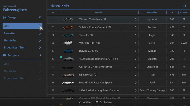 Fahrzeuge, die Sie über Autohändler und auf andere Weise beziehen, werden im Garage-Bereich der Fahrzeugliste gelagert. Achten Sie darauf, Fahrzeuge auf Ihren Parkplatz zu verschieben, wenn es in der Garage langsam zu voll wird.