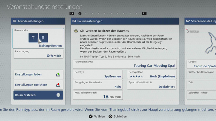 Wählen Sie im „Offene Lobby“-Modus „Neue erstellen“ im Raumauswahl-Bildschirm aus, um zum Raumerstellungs-Bildschirm zu gelangen. Der Raumerstellungs-Bildschirm ist in die folgenden Blöcke unterteilt: Grundeinstellungen, Raumeinstellungen, Streckeneinstellungen, Qualifying-Einstellungen, Renneinstellungen/Zeitrenneneinstellungen/Drift-Rennen-Einstellungen/Einstellungen für Freies Fahren/Langstreckenrennen-Einstellungen, Fahrzeugauswahlmethode, Leistungsfilter und „Fahroptionen beschränken“. Jeder Block ermöglicht die Anpassung diverser Einstellungen. (Bitte beachten Sie, dass „Qualifying-Einstellungen“ nur angezeigt wird, wenn Sie den Raummodus im „Grundeinstellungen“-Block auf „Training/Qualifying/Rennen“ oder „Training/Qualifying/Langstreckenrennen“ eingestellt haben.)