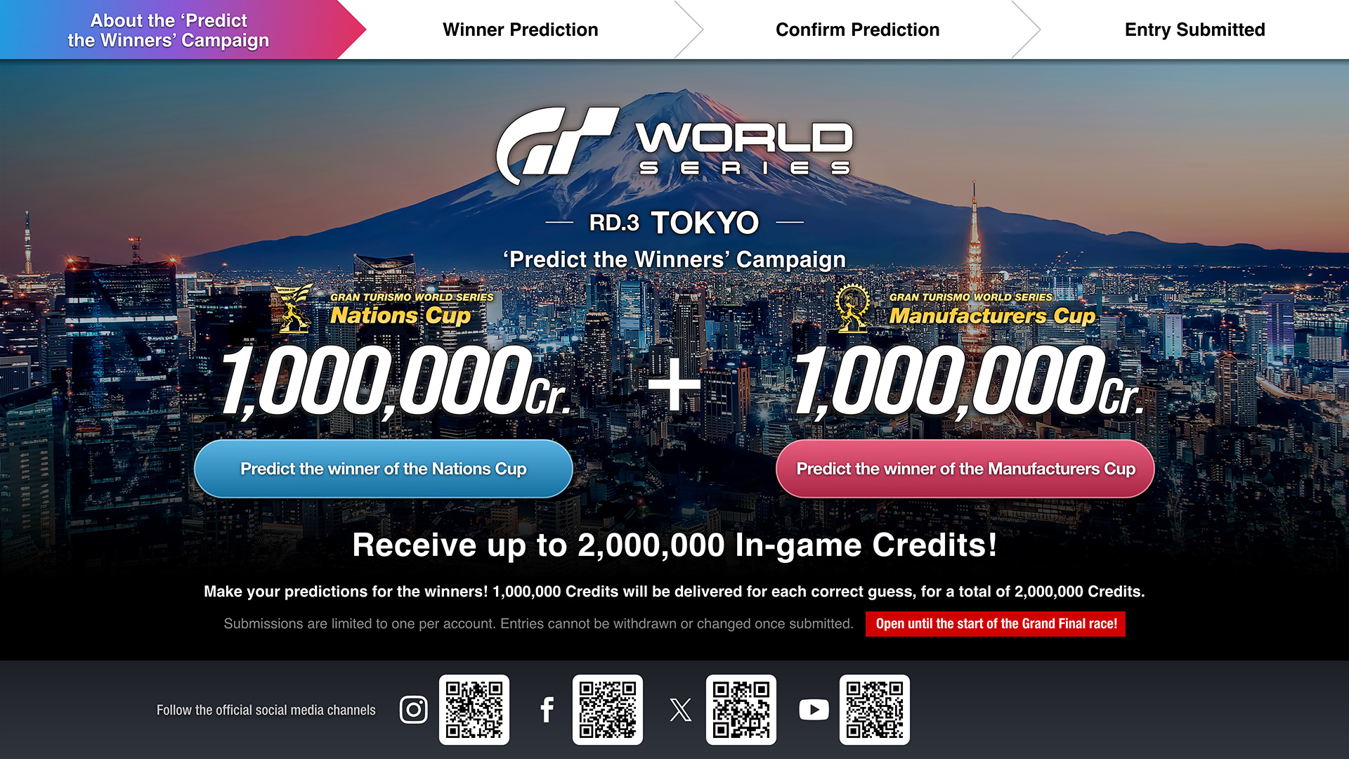 Im Rahmen dieser Aktion können Spieler Credits im Spiel (Cr.) gewinnen, wenn sie die Sieger im Manufacturers Cup und im Nations Cup korrekt vorhersagen. Für eine korrekte Prognose winken 1.000.000 Cr., also insgesamt 2.000.000 Cr., wenn man in beiden Turnieren die Sieger korrekt vorhersagt.