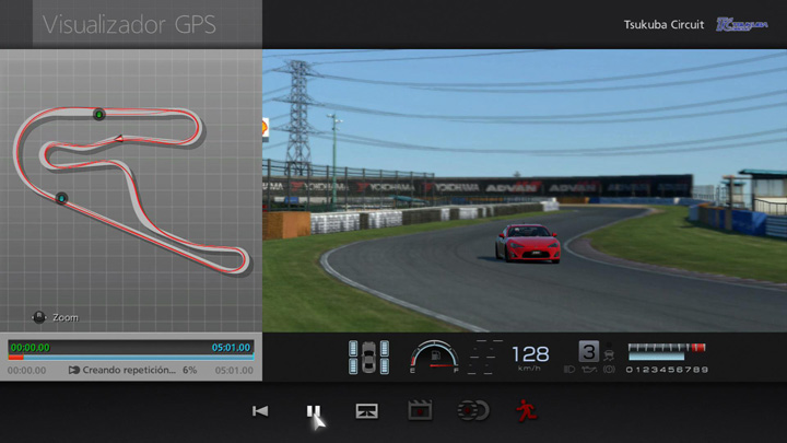 - La trazada se muestra en el mapa del circuito. El punto de inicio de la reproducción se indica mediante un punto azul, y el final, con un punto verde. La trazada de la reproducción se indica mediante una línea roja. Usa el joystick izquierdo para desplazarte por el mapa del circuito y el joystick derecho para acercar o alejar la cámara.